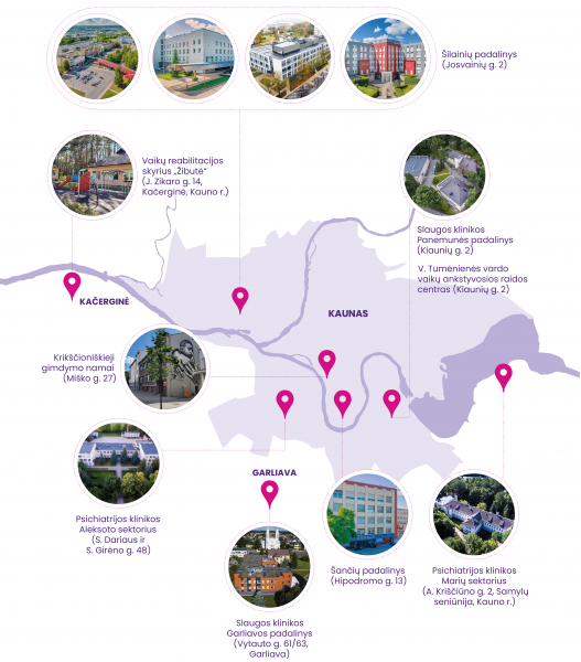 Padalinių geografija plati: nuo Šilainiuose ir Aukštuosiuose Šančiuose įsikūrusių pagrindinių padalinių iki miesto centre daugelį dešimtmečių veikiančių P. Mažylio ir Krikščioniškųjų gimdymo namų ar V. Tumėnienės vardo Vaikų ankstyvosios raidos centro Vičiūnuose.